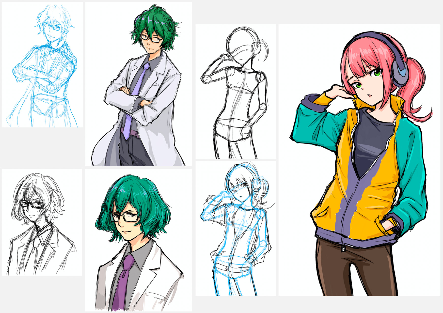 以下の絵も、ラフを何度も描き足したり削ったり変形しながら修正した例。 横顔が描き慣れていないので、何度も試行錯誤することになったが、最終的には気に入った形の横顔になった:
