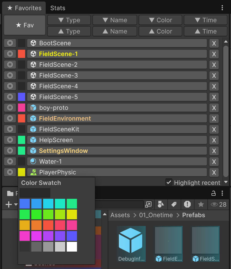 - アセットには好みの色をつけておけるので、 「デバッグ系は青、目下作業中は赤」 などと自分ルールでマークしておくと、 お気に入り登録が増えてきた場合でも目当てのアセットを見つけやすくなって便利です (色ソートで同じ色をまとめたりもできます)