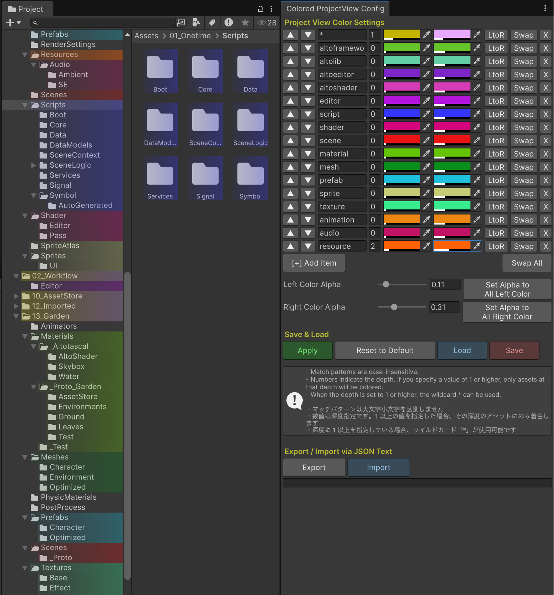 - 「01. Editor Extension」メニューの「ColoredProjectView」を有効化すると、Project ウインドウに色がつきます